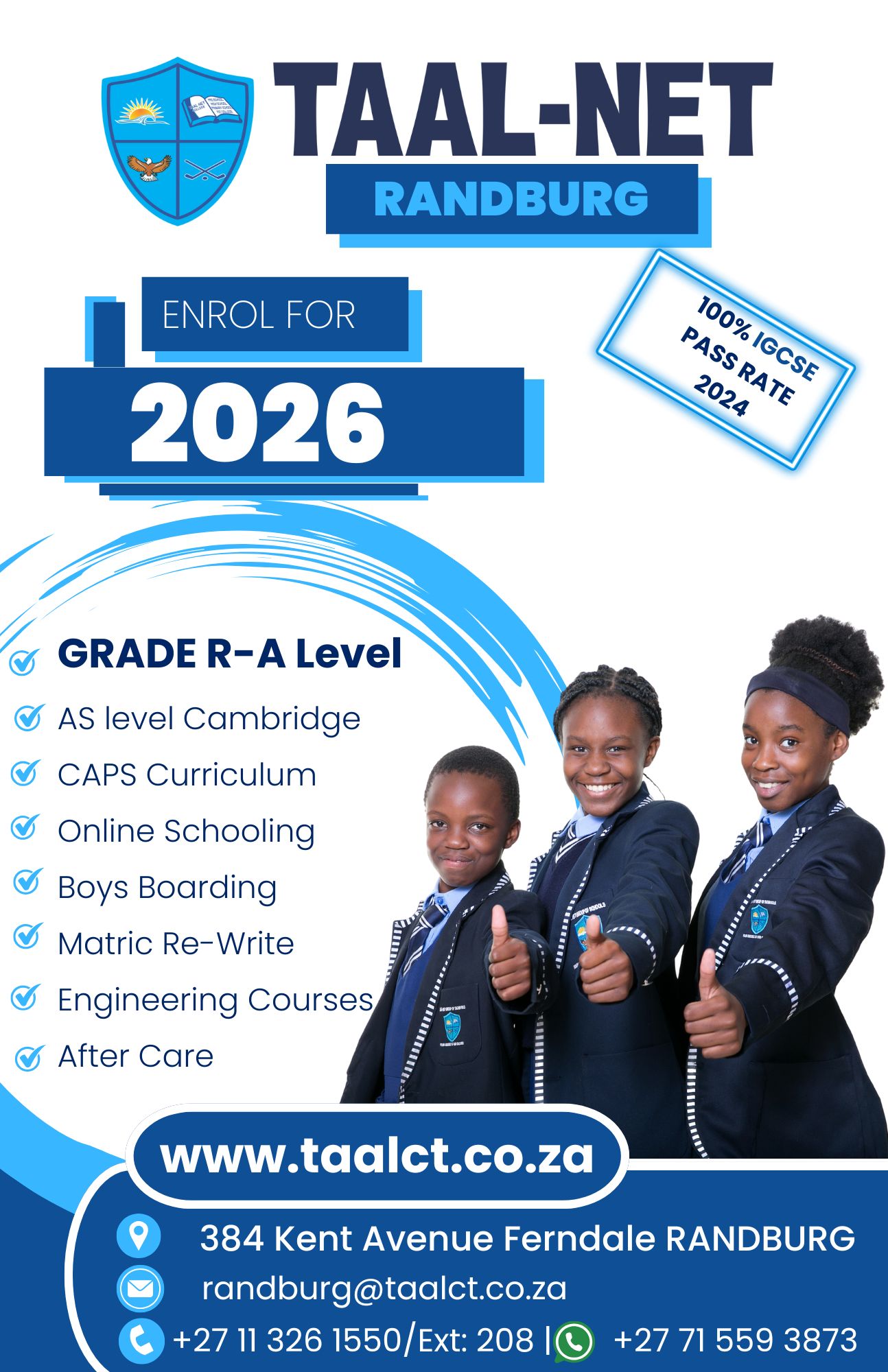 From Grade 8 to 12 students have a chance to choose either Cambridge curriculum or Caps curriculum. Taal-Net is one of the few Cambridge examination centers in Gauteng. The Cambridge curriculum gives our learners a competitive advantage in the global world.
